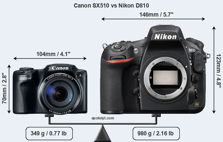 An illustration of the physical size and weight of the Canon SX510 and the Nikon D810 is provided in the side-by-side display below. The two cameras are presented according to their relative size. Three successive views from the front, the top, and the rear are shown. All width, height and depth measures are rounded to the nearest millimeter.