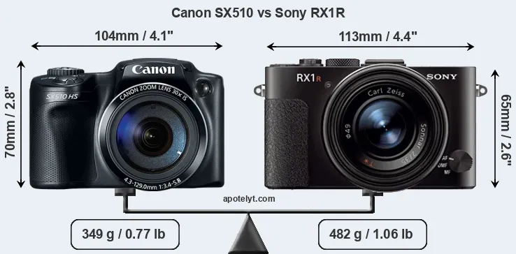 If the front view area (width x height) of the cameras is taken as an aggregate measure of their size, the Canon SX510 and the Sony RX1R are of equal size. However, the RX1R is substantially heavier (38 percent) than the SX510. In this context, it is worth noting that neither the SX510 nor the RX1R are weather-sealed.