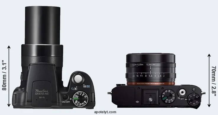 The side-by-side display below illustrates the physical size and weight of the Canon SX510 and the Sony RX1R. The two cameras are presented according to their relative size. Three consecutive views from the front, the top, and the rear side are shown. All width, height and depth dimensions are rounded to the nearest millimeter.