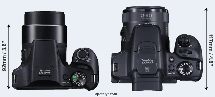 An illustration of the physical size and weight of the Canon SX520 and the Canon SX70 is provided in the side-by-side display below. The two cameras are presented according to their relative size. Three consecutive views from the front, the top, and the rear side are shown. All width, height and depth measures are rounded to the nearest millimeter.