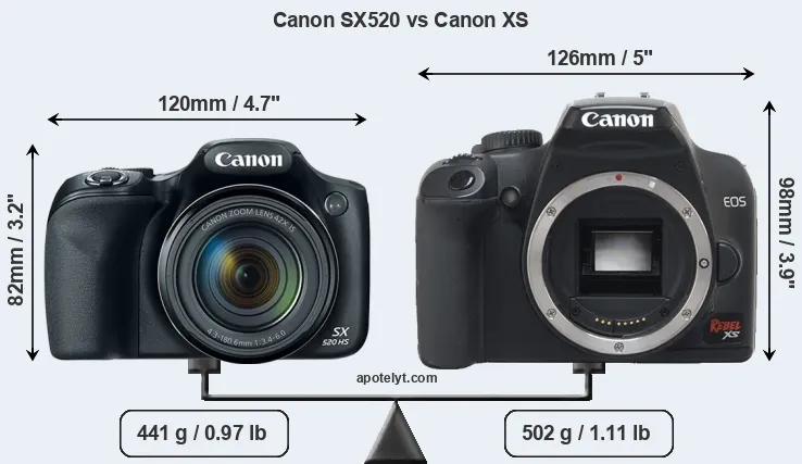 The Canon PowerShot SX520 HS and the Canon EOS Rebel XS (labelled Canon 1000D in some countries) are two digital cameras that were revealed to the public, respectively, in July 2014 and June 2008. The SX520 is a fixed lens compact, while the XS is a DSLR. The cameras are based on a 1/2.3-inch (SX520) and an APS-C (XS) sensor. The SX520 has a resolution of 15.9 megapixels, whereas the XS provides 10.1 MP.