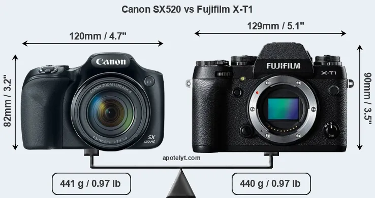 If the front view area (width x height) of the cameras is taken as an aggregate measure of their size, the Fujifilm X-T1 is notably larger (18 percent) than the Canon SX520. It is noteworthy in this context that the X-T1 is splash and dust-proof, while the SX520 does not feature any corresponding weather-sealing.