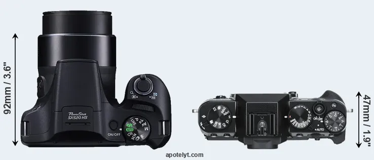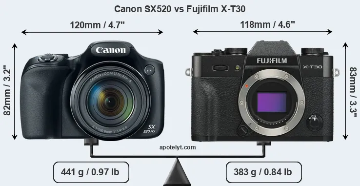 If the front view area (width x height) of the cameras is taken as an aggregate measure of their size, the Canon SX520 and the Fujifilm X-T30 are of equal size. In this context, it is worth noting that neither the SX520 nor the X-T30 are weather-sealed.