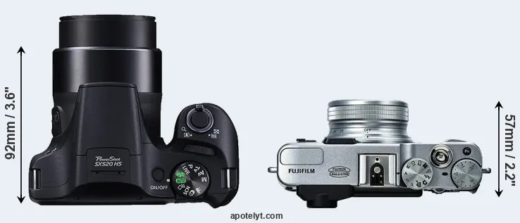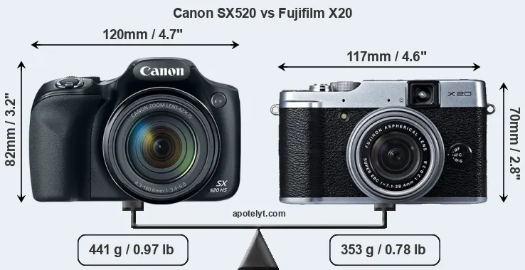 The physical size and weight of the Canon SX520 and the Fujifilm X20 are illustrated in the side-by-side display below. The two cameras are presented according to their relative size. Three consecutive perspectives from the front, the top, and the back are available. All width, height and depth measures are rounded to the nearest millimeter.