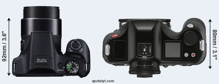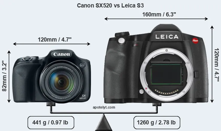 If the front view area (width x height) of the cameras is taken as an aggregate measure of their size, the Leica S3 is considerably larger (95 percent) than the Canon SX520. It is noteworthy in this context that the S3 is splash and dust-proof, while the SX520 does not feature any corresponding weather-sealing.