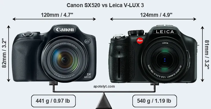 An illustration of the physical size and weight of the Canon SX520 and the Leica V-LUX 3 is provided in the side-by-side display below. The two cameras are presented according to their relative size. Three consecutive views from the front, the top, and the rear side are shown. All width, height and depth measures are rounded to the nearest millimeter.