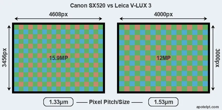 While the two cameras under review share the same sensor size, the SX520 offers a higher resolution of 15.9 megapixels, compared with 12 MP of the V-LUX 3. This megapixels advantage translates into a 15 percent gain in linear resolution. On the other hand, these sensor specs imply that the SX520 has a higher pixel density and a smaller size of the individual pixel (with a pixel pitch of 1.33μm versus 1.53μm for the V-LUX 3). In this context, it should be noted, however, that the SX520 is much more recent (by 2 years and 7 months) than the V-LUX 3, and its sensor will have benefitted from technological advances during this time that compensate for the smaller pixel size. Coming back to sensor resolution, it should be mentioned that neither of the two cameras has an anti-alias filter installed, so they are able to capture all the detail the sensor resolves.