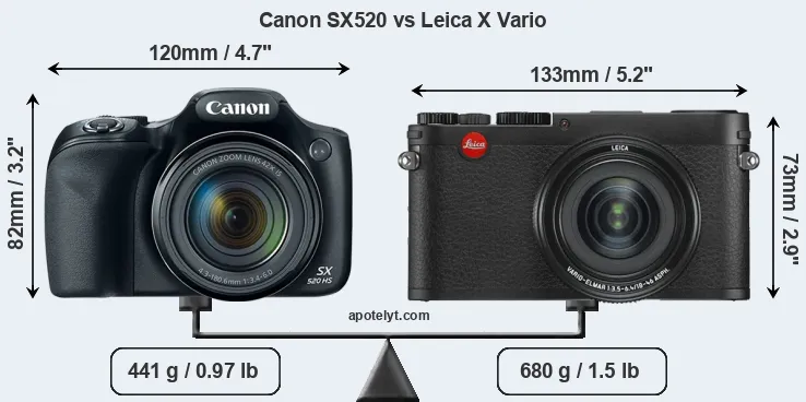 If the front view area (width x height) of the cameras is taken as an aggregate measure of their size, the Leica X Vario is somewhat smaller (1 percent) than the Canon SX520. However, the X Vario is substantially heavier (54 percent) than the SX520. In this context, it is worth noting that neither the SX520 nor the X Vario are weather-sealed.