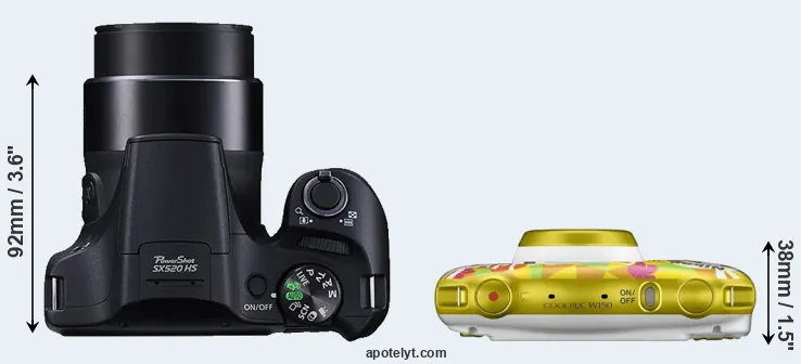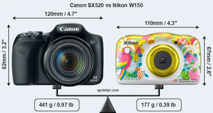 An illustration of the physical size and weight of the Canon SX520 and the Nikon W150 is provided in the side-by-side display below. The two cameras are presented according to their relative size. Three successive views from the front, the top, and the rear are shown. All size dimensions are rounded to the nearest millimeter.