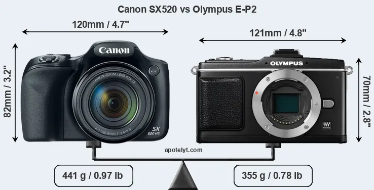 The physical size and weight of the Canon SX520 and the Olympus E-P2 are illustrated in the side-by-side display below. The two cameras are presented according to their relative size. Three consecutive perspectives from the front, the top, and the back are available. All size dimensions are rounded to the nearest millimeter.