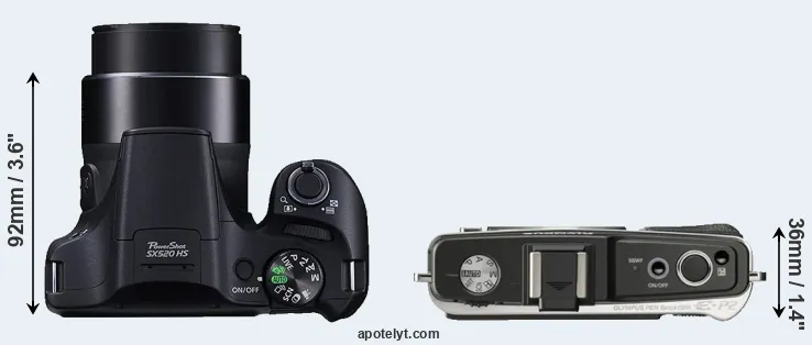 The above size and weight comparisons are to some extent incomplete and possibly misleading, as the SX520 has a lens built in, whereas the E-P2 is an interchangeable lens camera that requires a separate lens. Attaching the latter will add extra weight and bulk to the setup. You can compare the optics available for the E-P2 and their specifications in the Micro Four Thirds Lens Catalog.