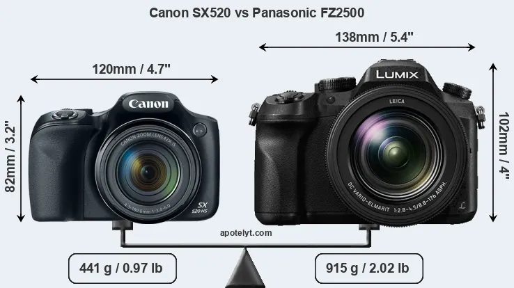 If the front view area (width x height) of the cameras is taken as an aggregate measure of their size, the Panasonic FZ2500 is considerably larger (43 percent) than the Canon SX520. Moreover, the FZ2500 is substantially heavier (107 percent) than the SX520. In this context, it is worth noting that neither the SX520 nor the FZ2500 are weather-sealed.