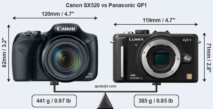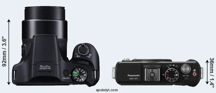 The physical size and weight of the Canon SX520 and the Panasonic GF1 are illustrated in the side-by-side display below. The two cameras are presented according to their relative size. Three consecutive views from the front, the top, and the rear side are shown. All width, height and depth dimensions are rounded to the nearest millimeter.