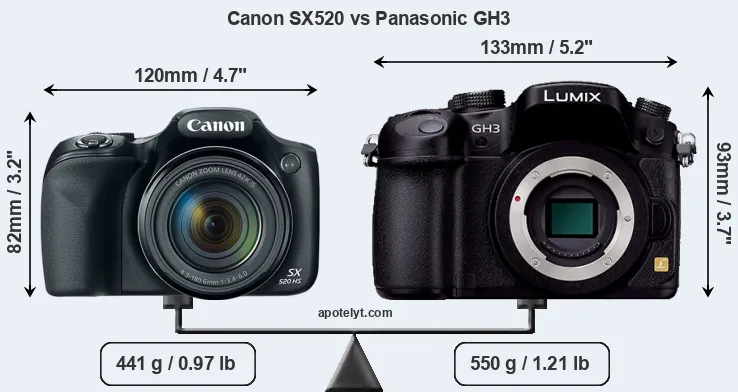 If the front view area (width x height) of the cameras is taken as an aggregate measure of their size, the Panasonic GH3 is notably larger (26 percent) than the Canon SX520. It is noteworthy in this context that the GH3 is splash and dust-proof, while the SX520 does not feature any corresponding weather-sealing.