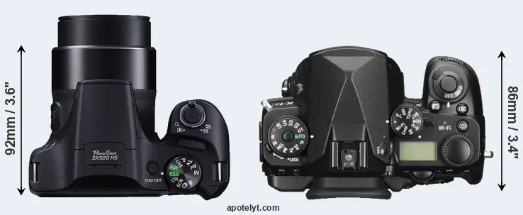 The above size and weight comparisons are to some extent incomplete and possibly misleading, as the SX520 has a lens built in, whereas the K-1 II is an interchangeable lens camera that requires a separate lens. Attaching the latter will add extra weight and bulk to the setup.