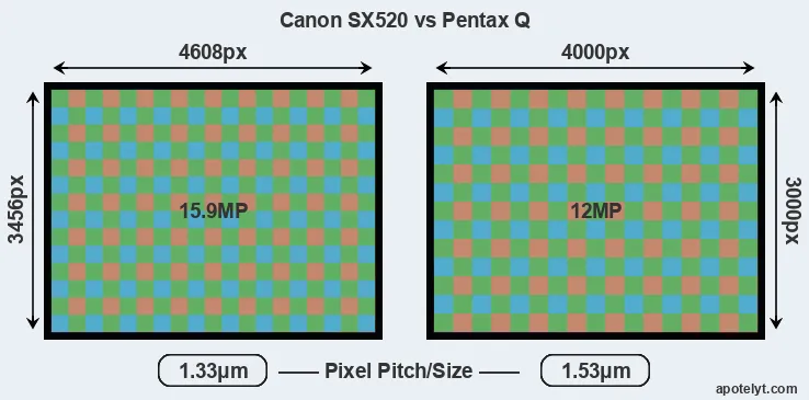 While the two cameras under review share the same sensor size, the SX520 offers a higher resolution of 15.9 megapixels, compared with 12 MP of the Pentax Q. This megapixels advantage translates into a 15 percent gain in linear resolution. On the other hand, these sensor specs imply that the SX520 has a higher pixel density and a smaller size of the individual pixel (with a pixel pitch of 1.33μm versus 1.53μm for the Pentax Q). In this context, it should be noted, however, that the SX520 is much more recent (by 3 years and 1 month) than the Pentax Q, and its sensor will have benefitted from technological advances during this time that compensate for the smaller pixel size. Coming back to sensor resolution, it should be mentioned that the SX520 has no anti-alias filter installed, so that it can capture all the detail its sensor resolves.