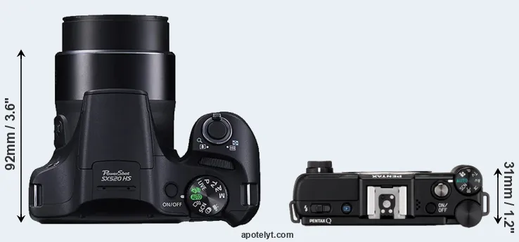 Going beyond this snapshot of core features and characteristics, what are the differences between the Canon PowerShot SX520 HS and the Pentax Q? Which one should you buy? Read on to find out how these two cameras compare with respect to their body size, their imaging sensors, their shooting features, their input-output connections, and their reception by expert reviewers.