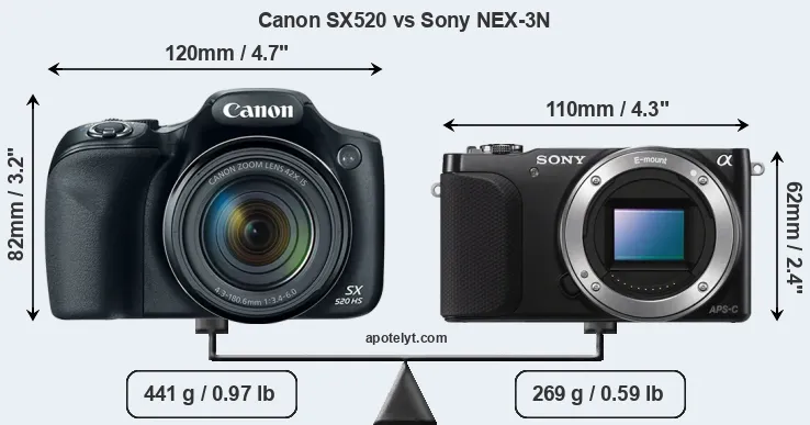 The physical size and weight of the Canon SX520 and the Sony NEX-3N are illustrated in the side-by-side display below. The two cameras are presented according to their relative size. Three consecutive perspectives from the front, the top, and the back are available. All width, height and depth measures are rounded to the nearest millimeter.