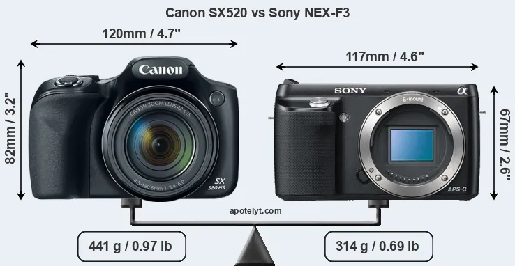 The above size and weight comparisons are to some extent incomplete and possibly misleading, as the SX520 has a lens built in, whereas the NEX-F3 is an interchangeable lens camera that requires a separate lens. Attaching the latter will add extra weight and bulk to the setup. You can compare the optics available for the NEX-F3 and their specifications in the Sony E-Mount Lens Catalog.