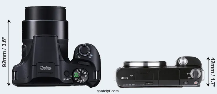 The physical size and weight of the Canon SX520 and the Sony NEX-F3 are illustrated in the side-by-side display below. The two cameras are presented according to their relative size. Three consecutive views from the front, the top, and the rear side are shown. All width, height and depth measures are rounded to the nearest millimeter.