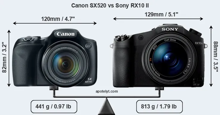 If the front view area (width x height) of the cameras is taken as an aggregate measure of their size, the Sony RX10 II is notably larger (15 percent) than the Canon SX520. Moreover, the RX10 II is substantially heavier (84 percent) than the SX520. It is noteworthy in this context that the RX10 II is splash and dust-proof, while the SX520 does not feature any corresponding weather-sealing.