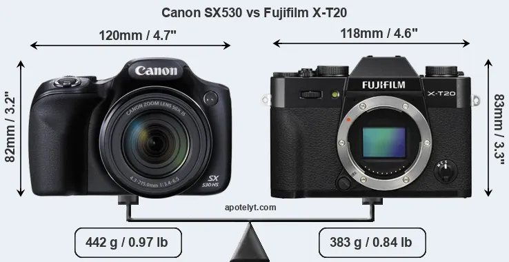 If the front view area (width x height) of the cameras is taken as an aggregate measure of their size, the Canon SX530 and the Fujifilm X-T20 are of equal size. In this context, it is worth noting that neither the SX530 nor the X-T20 are weather-sealed.