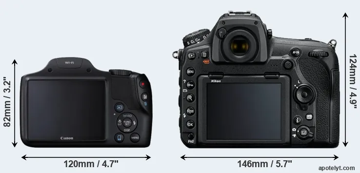 The physical size and weight of the Canon SX530 and the Nikon D850 are illustrated in the side-by-side display below. The two cameras are presented according to their relative size. Three successive views from the front, the top, and the rear are shown. All width, height and depth dimensions are rounded to the nearest millimeter.