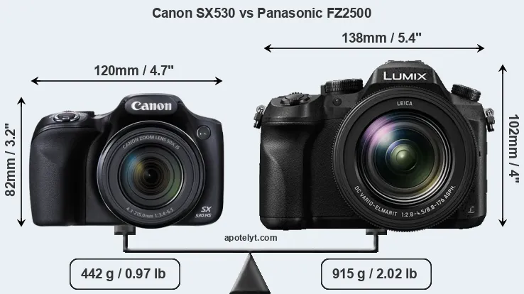The side-by-side display below illustrates the physical size and weight of the Canon SX530 and the Panasonic FZ2500. The two cameras are presented according to their relative size. Three consecutive perspectives from the front, the top, and the back are available. All width, height and depth measures are rounded to the nearest millimeter.