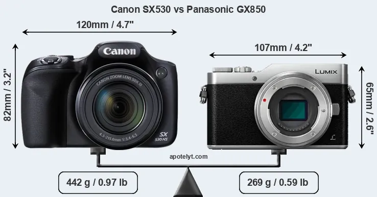An illustration of the physical size and weight of the Canon SX530 and the Panasonic GX850 is provided in the side-by-side display below. The two cameras are presented according to their relative size. Three consecutive perspectives from the front, the top, and the back are available. All size dimensions are rounded to the nearest millimeter.