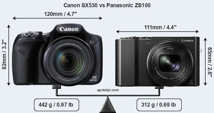 The physical size and weight of the Canon SX530 and the Panasonic ZS100 are illustrated in the side-by-side display below. The two cameras are presented according to their relative size. Three successive views from the front, the top, and the rear are shown. All width, height and depth measures are rounded to the nearest millimeter.