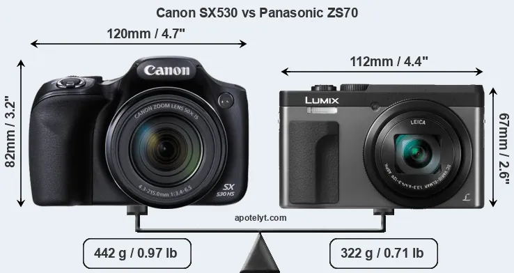 The side-by-side display below illustrates the physical size and weight of the Canon SX530 and the Panasonic ZS70. The two cameras are presented according to their relative size. Three consecutive perspectives from the front, the top, and the back are available. All width, height and depth dimensions are rounded to the nearest millimeter.