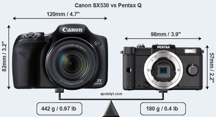 The above size and weight comparisons are to some extent incomplete and possibly misleading, as the SX530 has a lens built in, whereas the Pentax Q is an interchangeable lens camera that requires a separate lens. Attaching the latter will add extra weight and bulk to the setup.