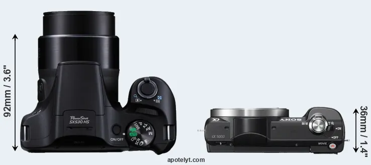 The side-by-side display below illustrates the physical size and weight of the Canon SX530 and the Sony A5000. The two cameras are presented according to their relative size. Three successive views from the front, the top, and the rear are shown. All width, height and depth dimensions are rounded to the nearest millimeter.