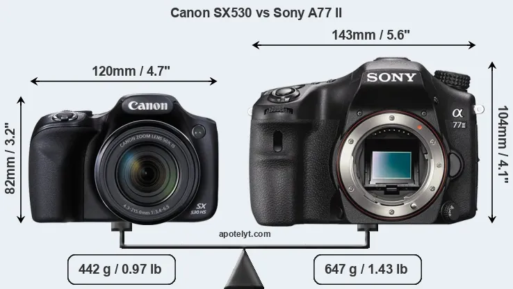 The above size and weight comparisons are to some extent incomplete and possibly misleading, as the SX530 has a lens built in, whereas the A77 II is an interchangeable lens camera that requires a separate lens. Attaching the latter will add extra weight and bulk to the setup.