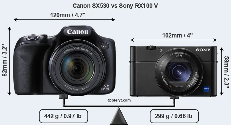 An illustration of the physical size and weight of the Canon SX530 and the Sony RX100 V is provided in the side-by-side display below. The two cameras are presented according to their relative size. Three successive views from the front, the top, and the rear are shown. All width, height and depth dimensions are rounded to the nearest millimeter.