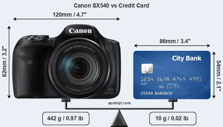 The physical dimensions of the Canon SX540 relative to a credit card are illustrated in the side-by-side display below. Three consecutive perspectives from the front, the top, and the back are presented. All width, height and depth dimensions are rounded to the nearest millimeter.