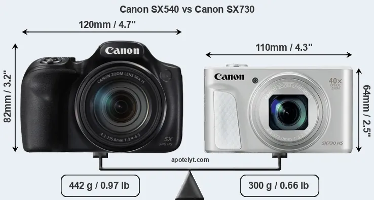 The side-by-side display below illustrates the physical size and weight of the Canon SX540 and the Canon SX730. The two cameras are presented according to their relative size. Three successive views from the front, the top, and the rear are shown. All width, height and depth dimensions are rounded to the nearest millimeter.