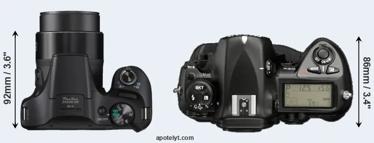 The above size and weight comparisons are to some extent incomplete and possibly misleading, as the SX540 has a lens built in, whereas the D2X is an interchangeable lens camera that requires a separate lens. Attaching the latter will add extra weight and bulk to the setup. You can compare the optics available for the D2X and their specifications in the Nikon Lens Catalog.