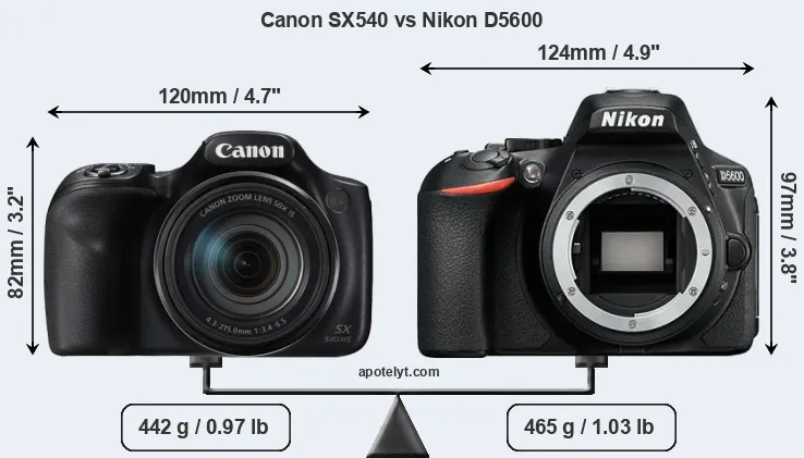 The above size and weight comparisons are to some extent incomplete and possibly misleading, as the SX540 has a lens built in, whereas the D5600 is an interchangeable lens camera that requires a separate lens. Attaching the latter will add extra weight and bulk to the setup. You can compare the optics available for the D5600 and their specifications in the Nikon Lens Catalog.