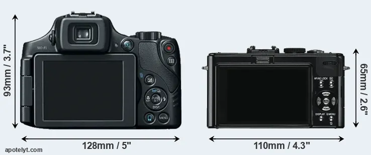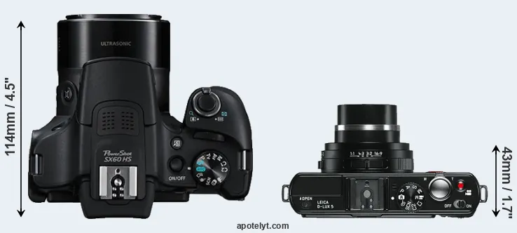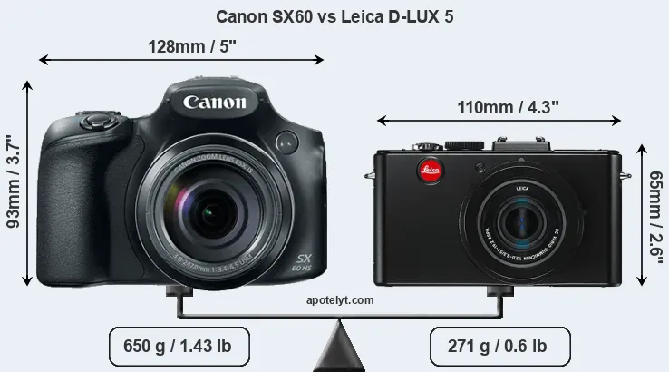 The side-by-side display below illustrates the physical size and weight of the Canon SX60 and the Leica D-LUX 5. The two cameras are presented according to their relative size. Three consecutive perspectives from the front, the top, and the back are available. All size dimensions are rounded to the nearest millimeter.