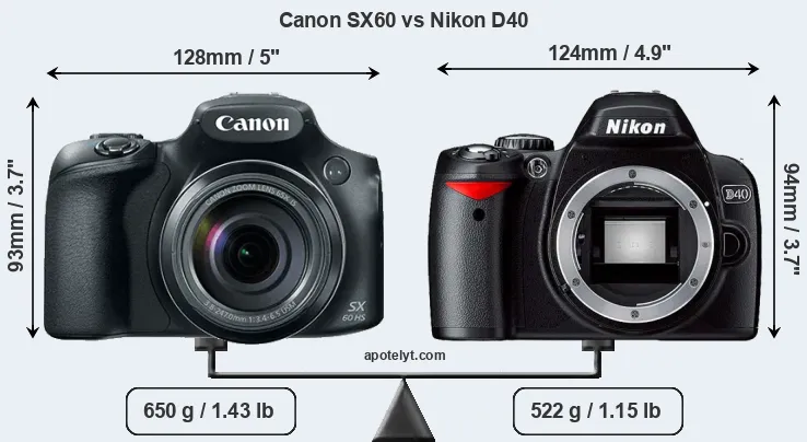 The physical size and weight of the Canon SX60 and the Nikon D40 are illustrated in the side-by-side display below. The two cameras are presented according to their relative size. Three consecutive views from the front, the top, and the rear side are shown. All size dimensions are rounded to the nearest millimeter.