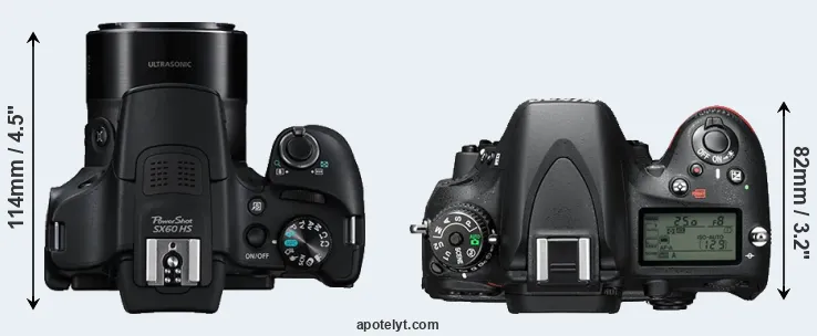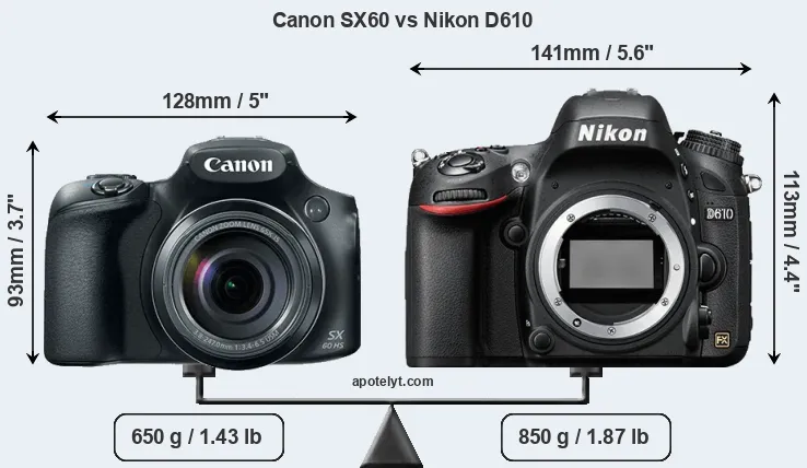 The side-by-side display below illustrates the physical size and weight of the Canon SX60 and the Nikon D610. The two cameras are presented according to their relative size. Three consecutive views from the front, the top, and the rear side are shown. All width, height and depth measures are rounded to the nearest millimeter.