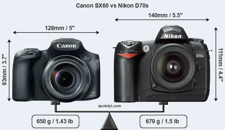 The physical size and weight of the Canon SX60 and the Nikon D70s are illustrated in the side-by-side display below. The two cameras are presented according to their relative size. Three consecutive views from the front, the top, and the rear side are shown. All width, height and depth dimensions are rounded to the nearest millimeter.