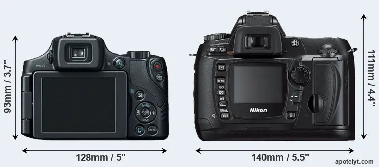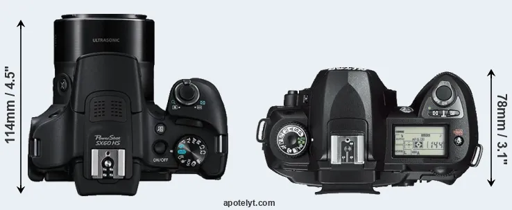 If the front view area (width x height) of the cameras is taken as an aggregate measure of their size, the Nikon D70s is notably larger (31 percent) than the Canon SX60. In this context, it is worth noting that neither the SX60 nor the D70s are weather-sealed.