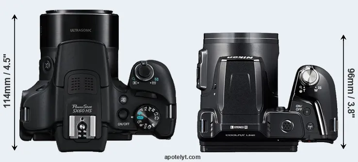 The side-by-side display below illustrates the physical size and weight of the Canon SX60 and the Nikon L840. The two cameras are presented according to their relative size. Three consecutive perspectives from the front, the top, and the back are available. All width, height and depth measures are rounded to the nearest millimeter.