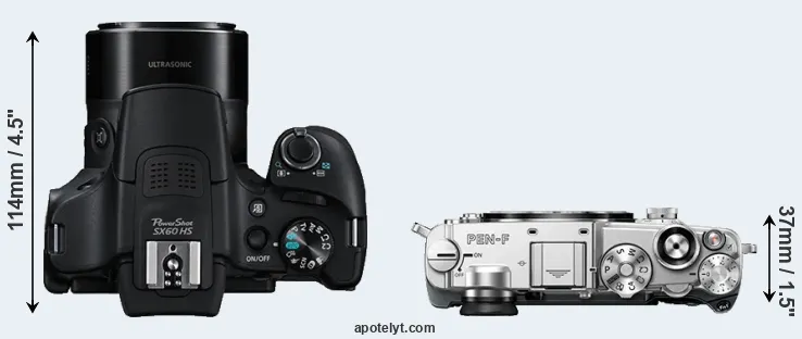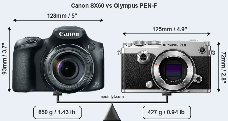 An illustration of the physical size and weight of the Canon SX60 and the Olympus PEN-F is provided in the side-by-side display below. The two cameras are presented according to their relative size. Three successive views from the front, the top, and the rear are shown. All width, height and depth dimensions are rounded to the nearest millimeter.