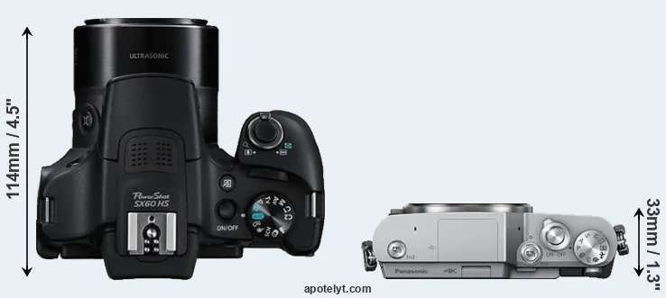 The Canon PowerShot SX60 HS and the Panasonic Lumix DMC-GX800 (labelled Panasonic GX850 in some countries) are two digital cameras that were revealed to the public, respectively, in September 2014 and January 2017. The SX60 is a fixed lens compact, while the GX800 is a mirrorless interchangeable lens camera. The cameras are based on a 1/2.3-inch (SX60) and a Four Thirds (GX800) sensor. The Canon has a resolution of 14.2 megapixels, whereas the Panasonic provides 15.8 MP.