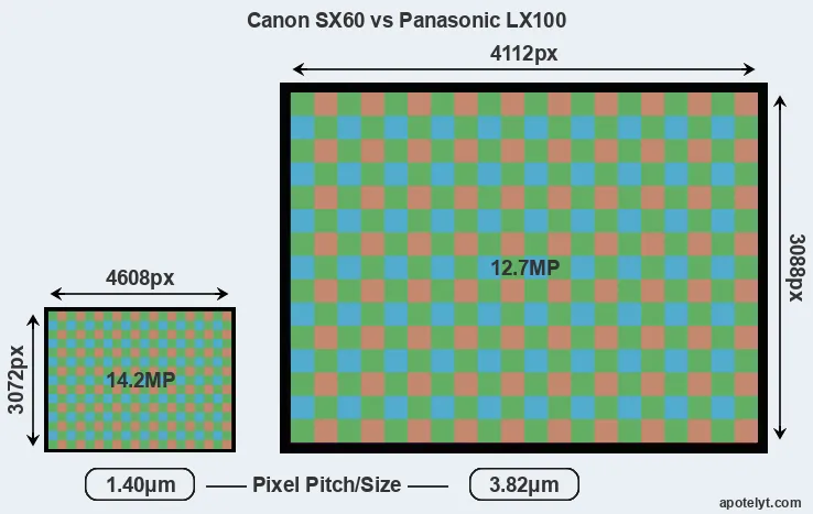 Despite having a smaller sensor, the Canon SX60 offers a higher resolution of 14.2 megapixels, compared with 12.7 MP of the Panasonic LX100. This megapixels advantage comes at the cost of a higher pixel density and a smaller size of the individual pixel (with a pixel pitch of 1.40μm versus 3.82μm for the LX100). It is noteworthy in this context that the two cameras were released in close succession, so that their sensors are from the same technological generation. Coming back to sensor resolution, it should be mentioned that the SX60 has no anti-alias filter installed, so that it can capture all the detail its sensor resolves.
