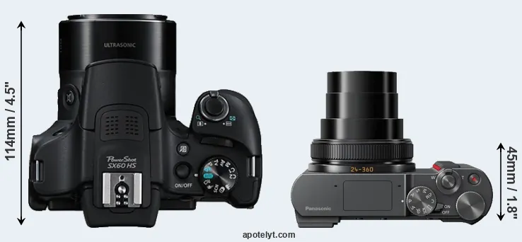 The side-by-side display below illustrates the physical size and weight of the Canon SX60 and the Panasonic TZ200. The two cameras are presented according to their relative size. Three consecutive perspectives from the front, the top, and the back are available. All width, height and depth measures are rounded to the nearest millimeter.