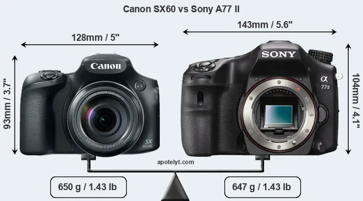 The above size and weight comparisons are to some extent incomplete and possibly misleading, as the SX60 has a lens built in, whereas the A77 II is an interchangeable lens camera that requires a separate lens. Attaching the latter will add extra weight and bulk to the setup.
